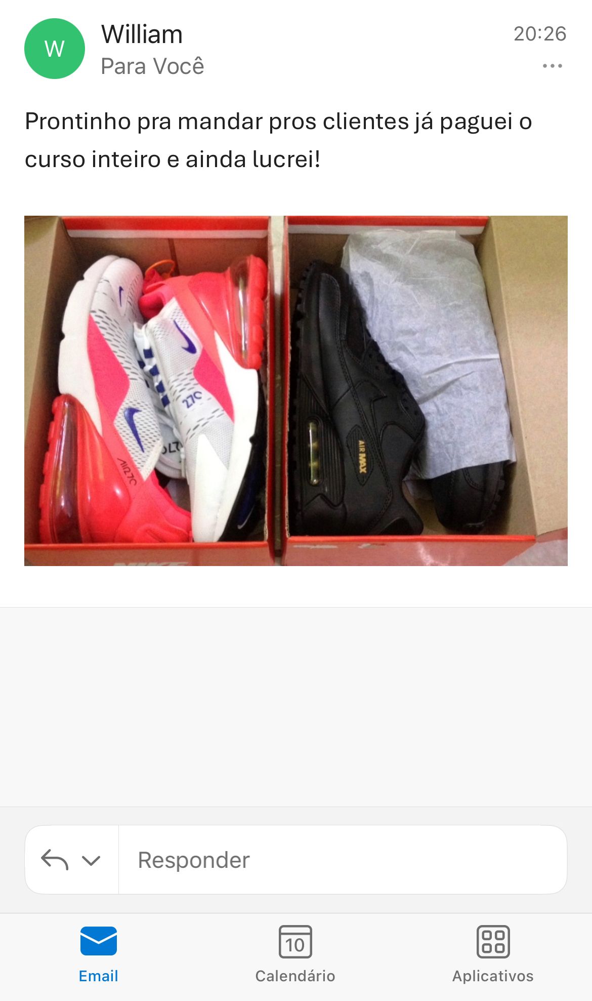 Eu sou o Tiago. Já trabalhei como CLT em transportadora e queria muito usar uns Air Max que via na loja, mas ou eu parcelava em 10x aquele valor caríssimo, ou comprava tênis falsificado no Brás, aquele tênis torno e feio que qualquer um que vê já sabe que é falso. Até virei até piada entre amigos por isso. Tudo mudou quando descobri a importação. Comecei do zero, testei fornecedores, errei, aprendi, até chegar no método certo, e hoje importo tênis primeira linha 1:1 por em média R$370 e vendo por até R$800. Faturando R$4.000 a R$5.000 por mês. Agora ensino exatamente como você pode fazer o mesmo, começando do zero.